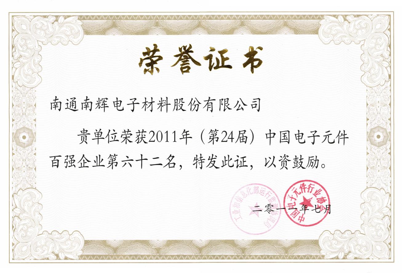 In July 2011, Nantong Nanhui Electronic Materials Co., Ltd. won the "62nd among the top 100 electronic components enterprises in China in 2011 (the 24th session)".
